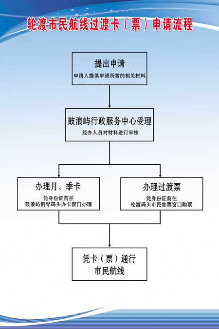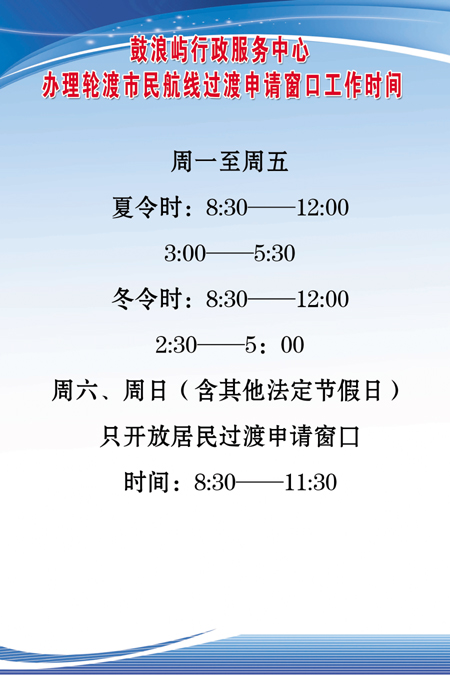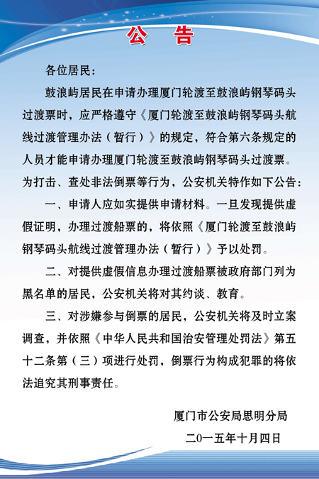 根據(jù)思明區(qū)鼓浪嶼街道辦事處通知要求,自2015年10月16日起,對鼓浪嶼島上居民親屬及島上用工等相關過渡卡(票)的審批業(yè)務均移至鼓浪嶼行政服務中心(鼓浪嶼原航海俱樂部)辦理,不再在所屬居委會辦理。