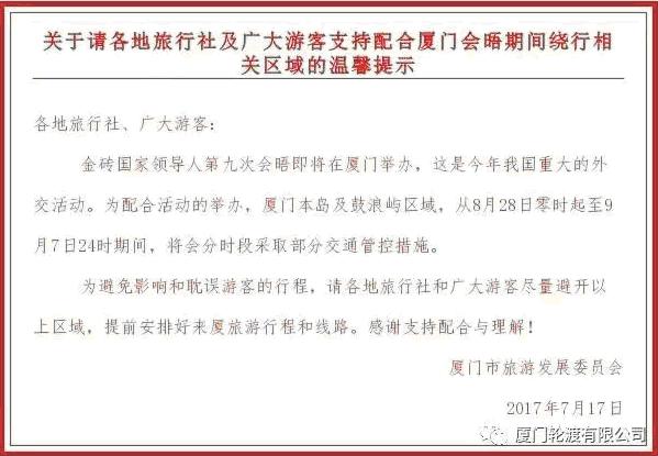 近階段,有不少小伙伴詢問小編關(guān)于廈門會晤期間去鼓浪嶼玩的注意事項。開說之前,大家先來看看廈門旅游發(fā)展委員會最近發(fā)出的官方公告: