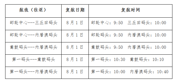 2017年8月1日9:50起,輪渡公司各航線【全線復(fù)航】。具體各碼頭航線復(fù)航時間如下: