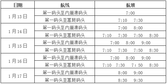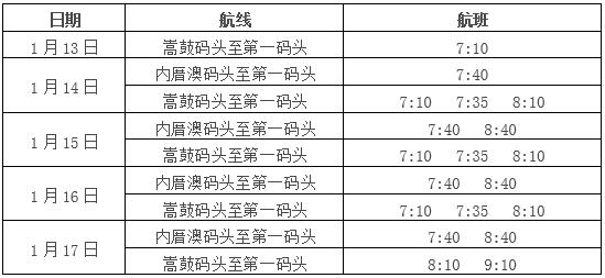 受潮汐影響,2021年1月13日至1月17日(共5天),第一碼頭往返內(nèi)厝澳碼頭航線和第一碼頭往返嵩鼓碼頭航線的部分航班將取消或改靠至廈門(mén)輪渡碼頭,具體安排如下: