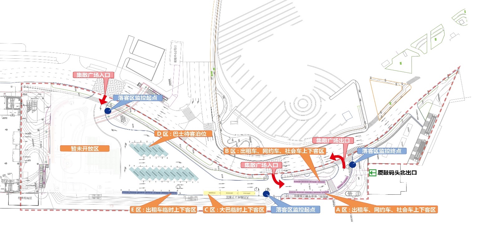 為改善郵輪母港片區(qū)游客出行條件,廈鼓碼頭北出口(旅客集散廣場)將于8月7日起試運行?,F(xiàn)將試運行有關事項公告如下: 一、開放時間:自2023年8月7日7:30起,對出租車、網約車和旅游大巴開放試運行。 二、集散廣場功能及管制措施: 1、允許網約車、出租車和旅游大巴在集散廣場短時停車上下客,其中,A、B、E區(qū)為網約車和出租車即停即走車位,C、D區(qū)為旅游大巴即停即走車位。 2、集散廣場全區(qū)域覆蓋交通監(jiān)控,網約車、出租車實行5分鐘限時通過,旅游大巴實行30分鐘限時通過。
